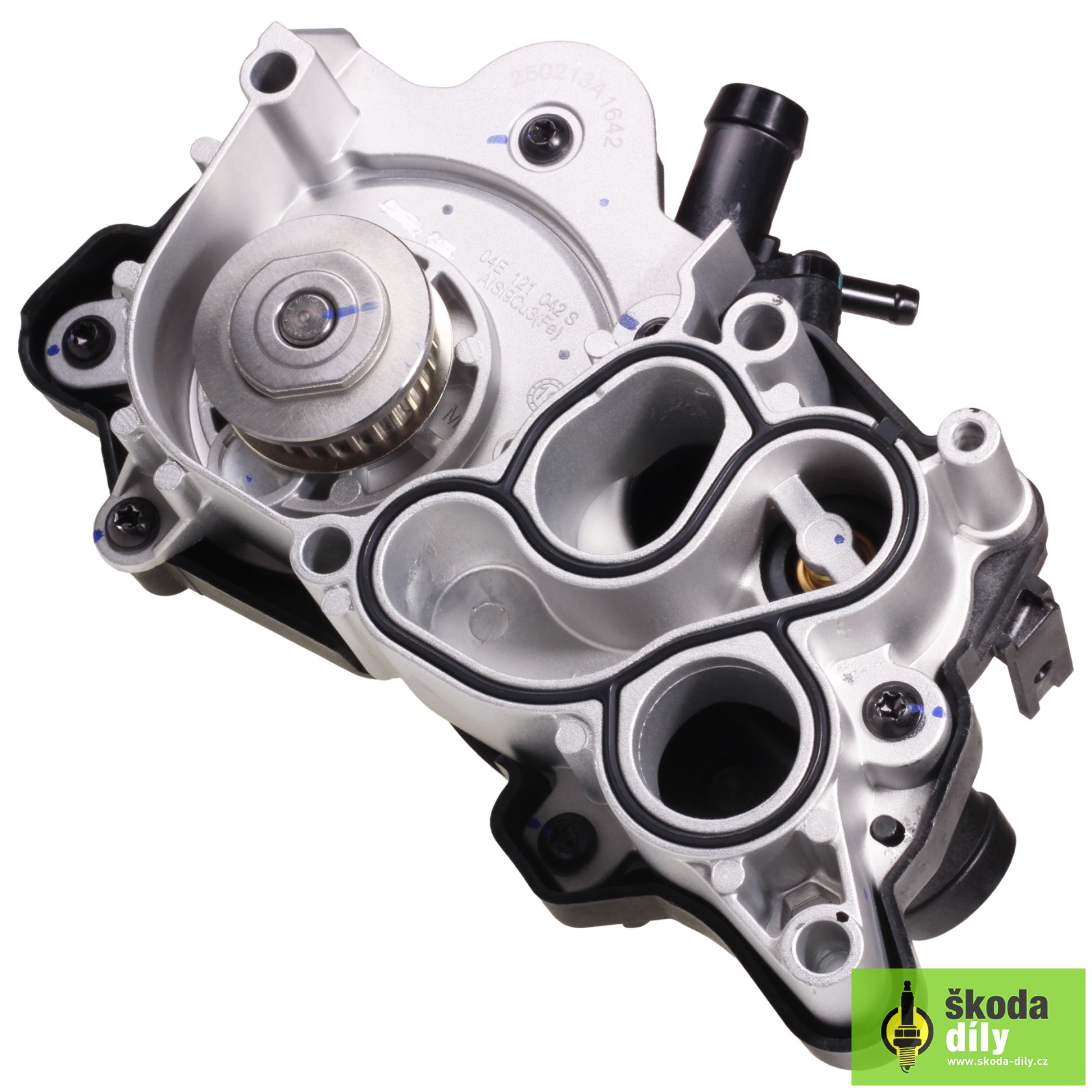 Coolant pump of the engine cooling circuit with coolant thermostat housing and cover. Suitable for vehicles with 1.2TSI 63kW/77kW/81kW, 1.4TGI 81kW, 1.4TSI 92kW/110kW, 1.4TSI IV 110kW engines.