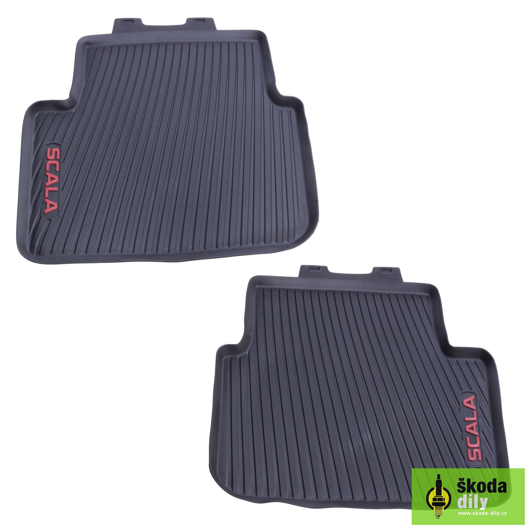 Set of 2pcs rubber mats for the rear seats, suitable for Škoda Scala with red Scala lettering. Ideal for use in the winter season, carpets are a perfect match and come with fixation holes for fixed attachment.